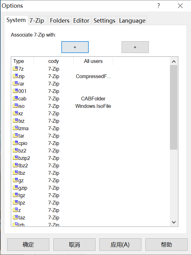7-Zip默认不关联文件后缀名称,不过可以在设置里关联支持的文件格式