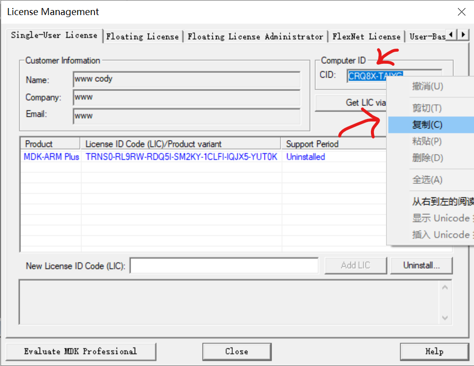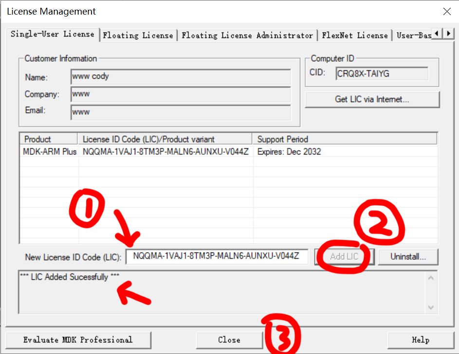将刚刚复制的密码粘贴到1位置,然后点击2位置的Add LIC,确认箭头部分显示的是***LIC Added Successfully***,然后上面的列表会有一行刚刚添加的证书,然后点击3位置的Close关闭界面