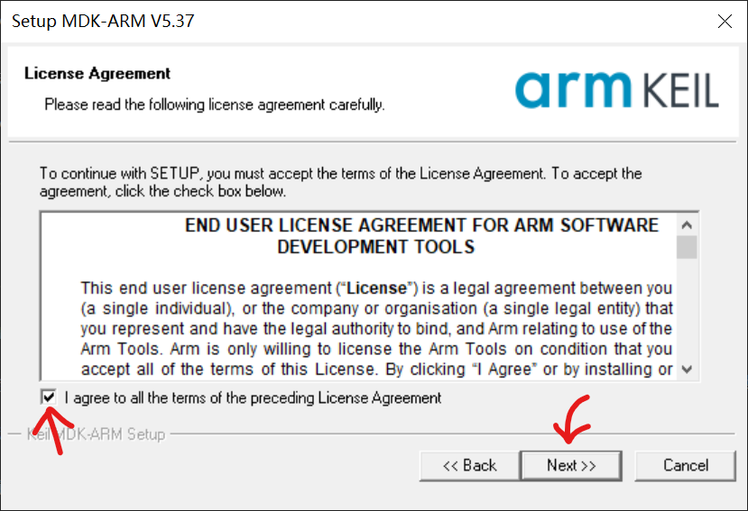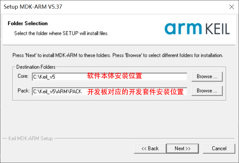 这边是选择安装位置的,上面的是Keil本身安装的位置,下面的是对应的开发板的开发套件的安装位置,设置好以后点击Next>>