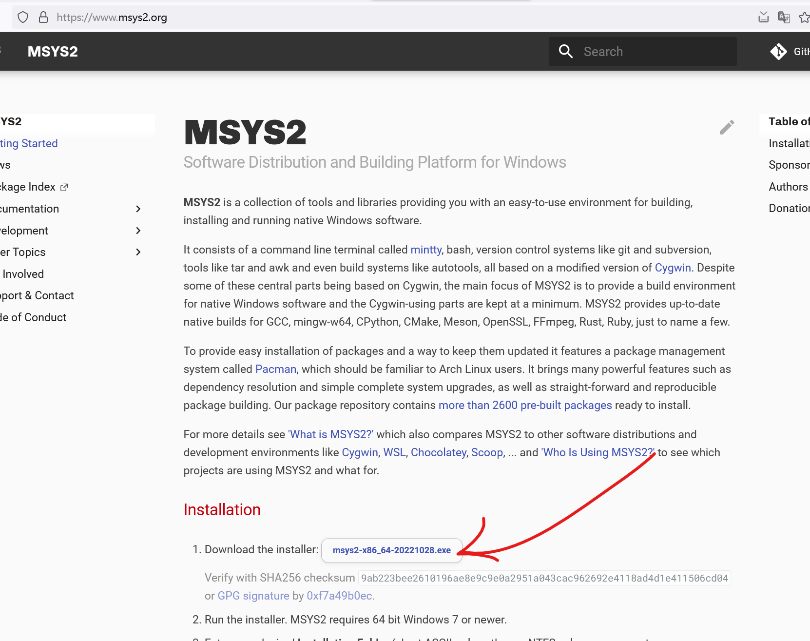 请访问该镜像目录,翻到最下面,找到名为 msys2-x86_64-<日期>.exe 的文件(如 msys2-x86_64-20221028.exe),下载安装即可。