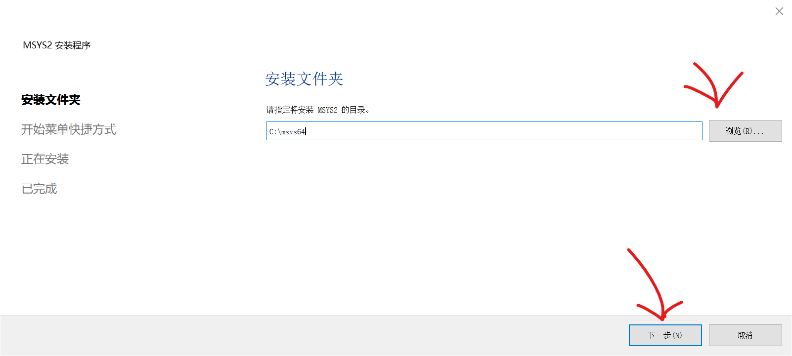 如果这边改了路径,后面所有C:\msys64都需要修改成你的安装位置