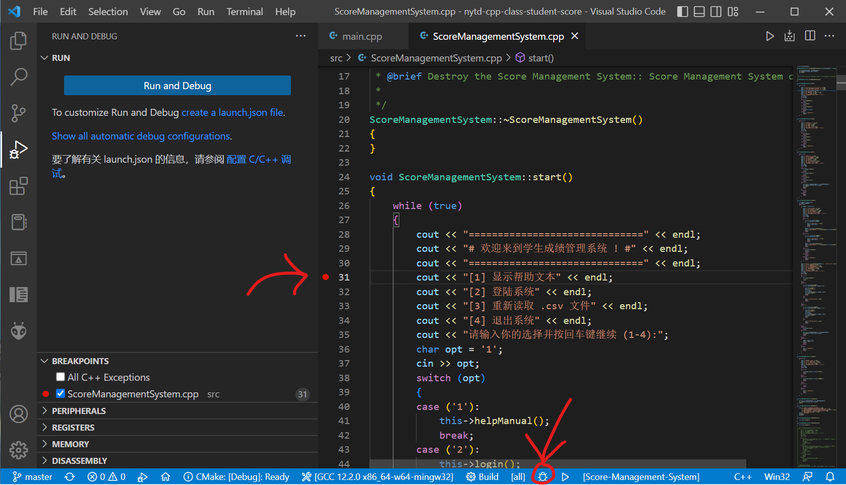 可以随便在某一行你感兴趣的代码处打一个断点,比如图中的第31行,然后点击下方的从🐞图标