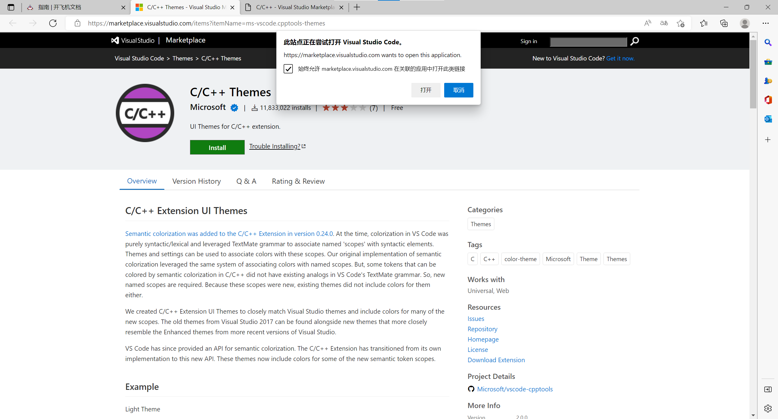 然后浏览器上方的弹窗记得允许打开VScode哦,这里是用edge浏览器演示的,其他浏览器可能会有所不同