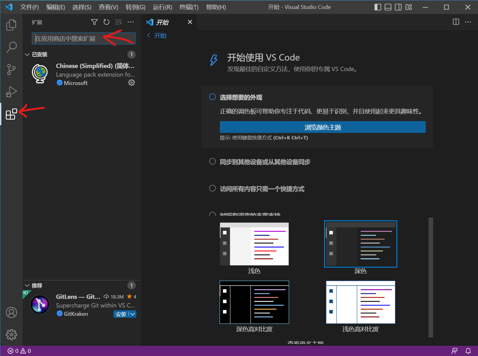下面是VScode第一次启动的页面,右下角过一小会会提示你安装中文语言包,很贴心吧