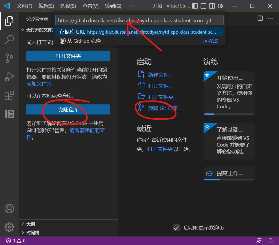VScode会提示你克隆一个仓库或者打开一个文件夹