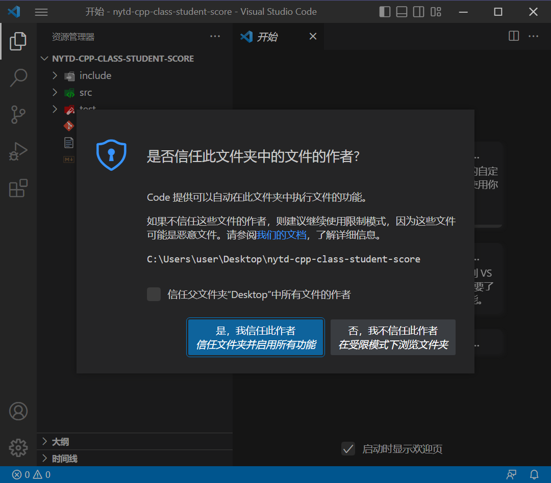 弹出的窗口会询问你是否信任此文件夹,是为了安全考虑,默认会禁用插件。如果你信得过仓库内容的话,就信任文件夹吧。