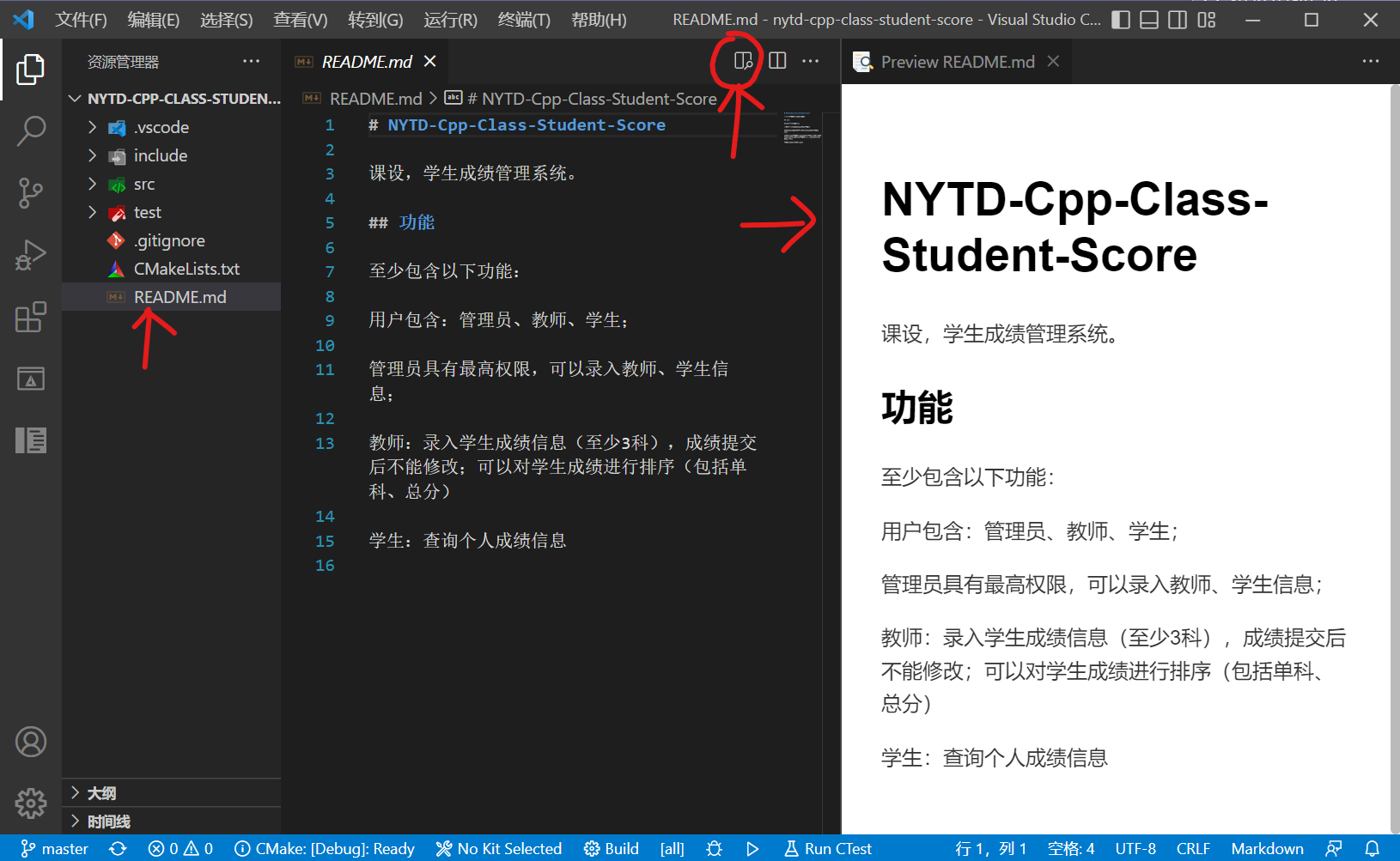 右上角的这个按钮是打开一个实时预览markdown文件的窗口,挺有用的。