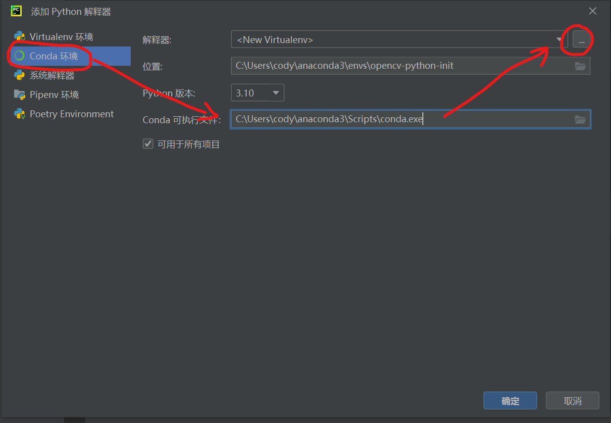 在弹出的界面左侧,选择Conda 环境,确认箭头所指的Conda 可执行文件是否存在,如果没有的话,请手动找到你安装的anaconda可执行文件。然后点击右上角的三个小点点