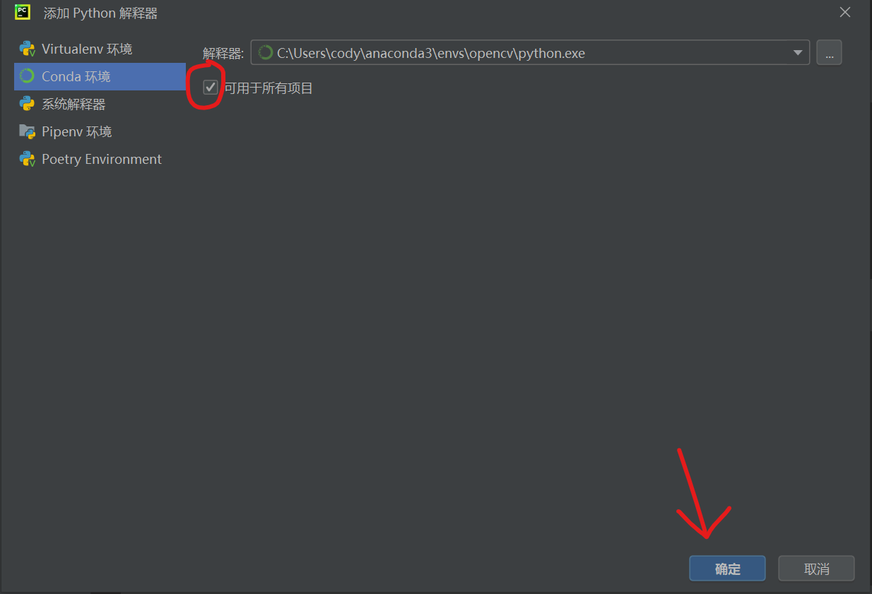 在弹出的界面里,找到你的环境位置,然后选择环境名称目录下的python.exe