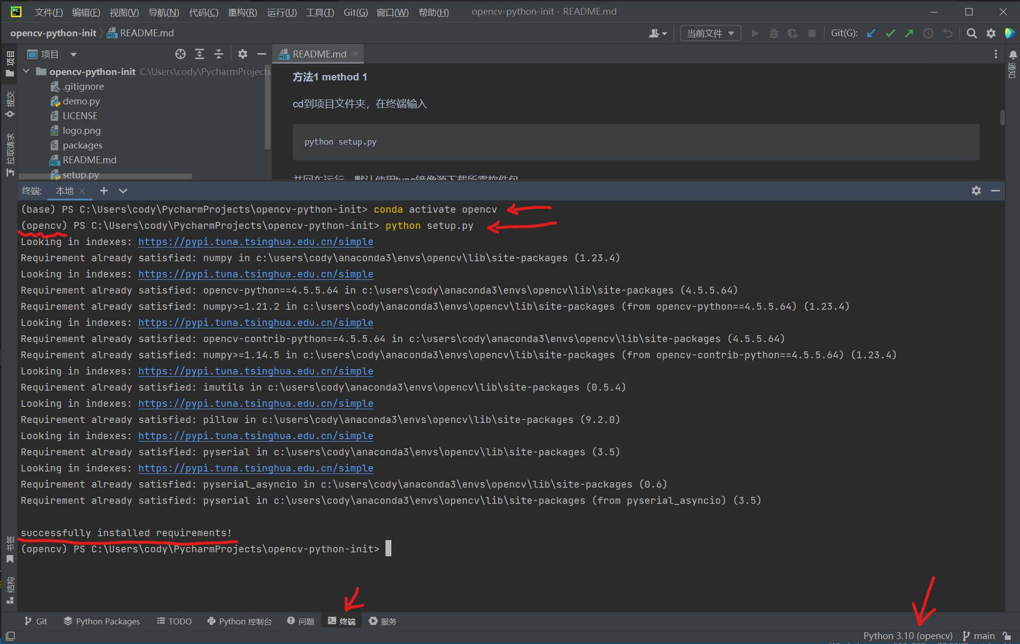 这个时候你的终端最左侧应该会从(base)变成(opencv)或者<conda环境名称>