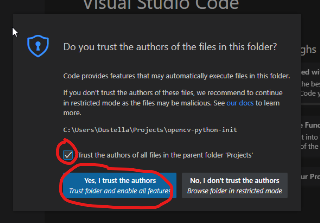 这边会询问你是否信任仓库,可以勾选信任父文件夹,这样下次其他克隆到这个位置的仓库就不用再点信任了。