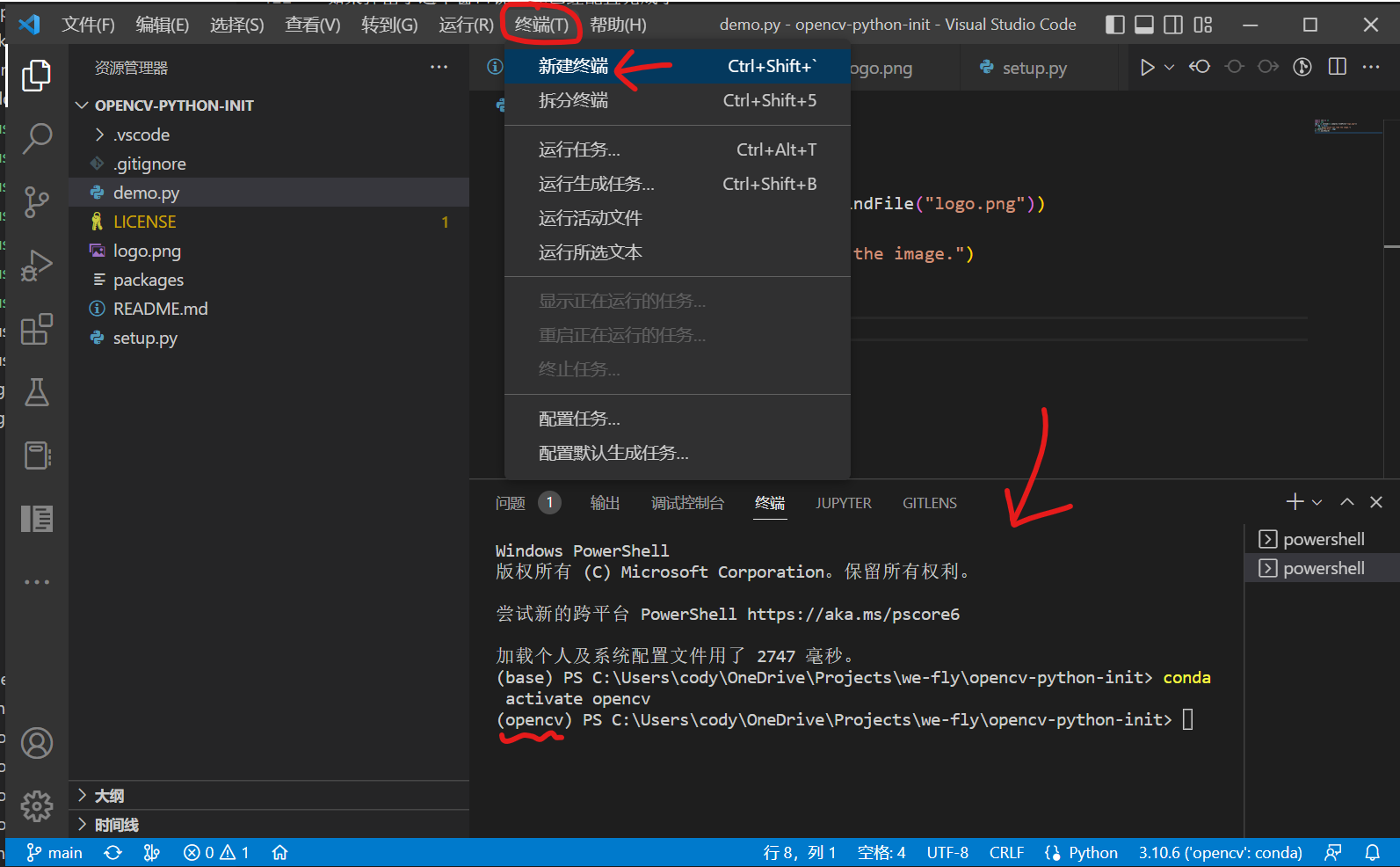 点击上方的终端 - 新建终端,下方会自动切换到你设置的conda环境